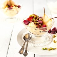 Serving: Place the ice cream in a bowl, add two halves of the pear beside it. Drizzle with raspberry sauce and sprinkle with pistachios.