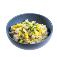 Ginger-pineapple rice is a Hawaiian dish both in spirit and preparation method. All the ingredients are stir-fried in a hot wok, and at the end, sesame oil is drizzled on top. This rice can be enjoyed as a standalone dish or served as a side to meat—the acidity from the pineapple helps break down fats. Keep in mind that the rice has a slightly mushy texture, and if you prefer a fluffier texture, simply add less water.