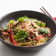 Dress the glass noodles with the sauce and vegetables, sprinkle with sesame seeds, and serve.
