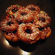 For decoration, you can use various creams and glazes, shredded coconut, colorful sprinkles, etc. To shape the donuts, you can use: for the outer circle — a cut bottle with a diameter of about 10 cm, for the inner circle — a bottle cap.