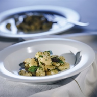 To prepare the pesto, evenly toast the pine nuts in a dry skillet (5 minutes), stirring. Transfer to a plate and let cool. Place the nuts in a blender with the basil and grated Parmesan. Slowly add the olive oil, season with salt and pepper.