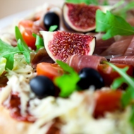 Mix the ham and figs with the arugula leaves. Add the onion, halved tomatoes, olives, and grated goat cheese.