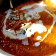 When the vegetables are ready, peel them and squeeze out the garlic. They are very easy to peel. While hot, blend them in a blender, add to the soup pot, add a tablespoon of curry paste, and carefully stir in the milk until the soup reaches the desired consistency. Season with salt, pepper, and fresh thyme.