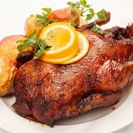 Goose stuffed with apples, lingonberries, and prunes