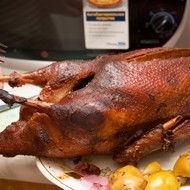 Preheat the oven to 374°F. Prick the goose breast with a fork, place the bird in a baking dish, cover with foil, and roast for about an hour. Then remove the foil and baste with juices, draining excess fat. Cover the goose with foil and roast for another 45 minutes.