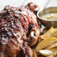 Drizzle the goose with the sauce and serve with potatoes and applesauce.