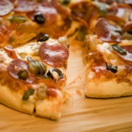Evenly spread the pureed tomatoes on the pizza bases, drizzle with olive oil, and sprinkle with salt, pepper, thyme seeds, and marjoram. Top with thinly sliced salami, pepper cubes, onion rings, and tomato wedges.