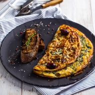 Pour the egg mixture into a hot skillet with a metal handle and arrange the spinach and mushrooms on one half of the skillet. Place it in an oven preheated to 356°F for 10–12 minutes.