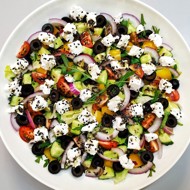 Slice the onion into half rings, cut the olives in half, and add them to the salad.