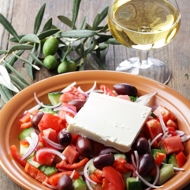 Thinly slice the red onion, tomatoes (such as Roma or grape), cucumber, and Kalamata olives, and mix everything together.