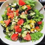 To assemble, place lettuce leaves and chopped vegetables at the bottom of the plate. Cut the cheese into cubes and simply place it on top of the vegetables along with the olives.