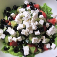 Chop the head of lettuce, young spinach leaves, and slice the tomato. Cut the cucumber lengthwise, then slice it thinly. Slice the sweet onion and sweet green pepper, removing the seeds, into rings. Cut the cheese into cubes and finely chop the green marjoram.