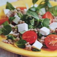 Chop the vegetables. For the dressing, mix yogurt, grated cucumber, olive oil, and mint.