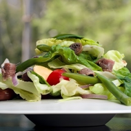 Prepare a dressing from olive oil, vinegar, mustard, salt, and pepper. Combine with the chopped shallots and herbs.
