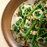 In a skillet, melt the butter and add the nuts. Lightly toast until golden brown for 2-3 minutes, then add the beans. Stir, season with salt and pepper.