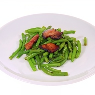 Drizzle the warm dressing over the beans and top with pieces of bacon.