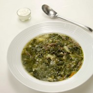 Add the sautéed vegetables and sorrel stems along with the water to the boiling broth with potatoes.