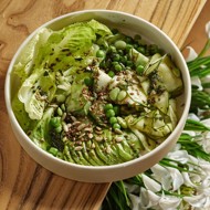 On a plate, arrange the sliced avocado, alongside the sliced cucumbers, zucchini, and salad mix. Top with edamame beans.