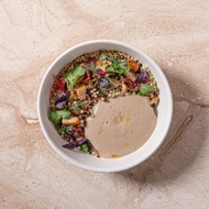 Assemble the dish. In a bowl, place the buckwheat with mushrooms, drizzle the mushroom sauce on the side. Garnish with sprigs of dill, green onion, and parsley leaves.