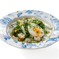 Serve the green soup with hake and half a boiled egg. Garnish with herbs.