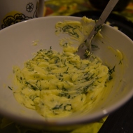 Wash the dill well, chop finely, add it to the butter, mash with a fork, and mix thoroughly.