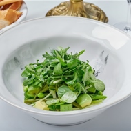 Dip the tips of the asparagus in boiling water for 1-2 minutes, then rinse in a colander under cold water. Cut the zucchini into rounds and steam until slightly tender, ensuring the vegetable does not become too soft, then cool. Boil the edamame beans in boiling water for 1 minute, then cool as well.