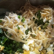 Finely chop the bunch of green onions, add 2 very hard-boiled, but crushed eggs, and 50 g of grated cheese.