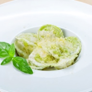 Chop the bacon into small pieces, sauté in a pan, pour in the cream, heat through, and add the chopped herbs. The sauce is ready in 3 minutes.