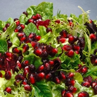 In a large bowl, place the salad greens and pomegranate seeds. Drizzle with the vinaigrette and toss.