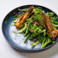 This salad from Chef John Smith, the concept chef of Ocean Breeze Restaurant, is crafted on the principle of 'do no harm' — it contains nothing overly caloric or unhealthy, and even the wasabi mayonnaise does not weigh down the dressing as much as it adds intrigue to the flavor. With the spicy sauce, the salad made of broccoli, green beans, and green onions does not come off as overly grassy. Against the green backdrop, the white-pink shrimp look particularly festive.