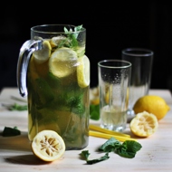 Pour the tea into a pitcher, squeeze in the lemon juice, add the mint leaves, and then pour in the water.