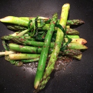 For this dish, you need thick seasonal asparagus; mini asparagus won't work. It's also better to use seasonal green onions with white bulbs. If you don't have a grill, you can do the same in a wok pan, see photo.