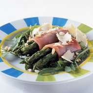 Cut the thin slices of prosciutto in half lengthwise (30 grams is approximately 2 thin slices of ham). Wrap 4 asparagus spears in each slice.