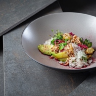 Grill the avocado on a griddle or skillet with olive oil, then slice it into wedges. Top it with quinoa, halved cherry tomatoes, and cilantro leaves, and drizzle with a citrus dressing.