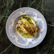 Sear the mini romaine on high heat in olive oil on the grill for 3–4 minutes.