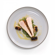 Grilled chicken breasts with leek confit and seasonal herb pesto