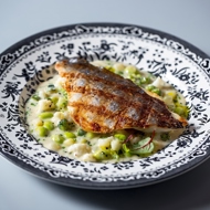 Grill the dorado fillet on a barbecue or grill rack: first, skin-side down for 3-4 minutes, then flip it over, and once it loses its translucency, remove it from the grill.