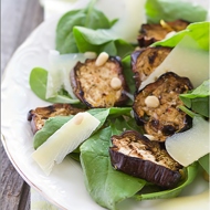 On a plate, arrange the salad greens and marinated eggplant. Sprinkle with cheese and pine nuts.