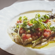 Prepare a tomato tartare. Grate a fresh tomato, add a little grated garlic, black pepper, salt, and oil.