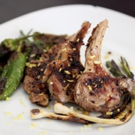 Wrap the lamb chops with garlic stalks, securing them with toothpicks.