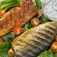 Serve the fish on a bed of salad greens with cherry tomatoes and sauce.