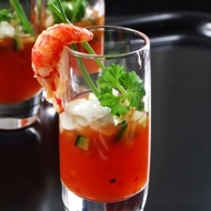 In deep plates, pour a ladle of sangrita, top with shrimp and diced avocado.