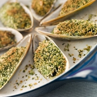 Separate the mussel shells. Arrange the mollusks on a baking sheet and sprinkle with the breadcrumb mixture, completely covering the mussels. Place under the grill for 2 minutes. Serve the cooked mussels on serving plates, garnished with lemon wedges.