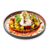 Place the pineapple and cherry tomatoes on the bread, top with burrata, sprinkle with pistachios, and drizzle with balsamic cream.