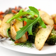 The secret of this seemingly simple dish lies in using young, small potatoes — they are significantly more tender and absorb sauces better. The chives must have flowers — their unique aroma and color add a piquant touch to the salad.