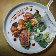 For the garnish: Clean the champignon mushrooms, chanterelles, morels (previously soaked), and porcini mushrooms, and sauté in butter with the mini potatoes (previously boiled), shallots, parsley, salt, and pepper until cooked through.
