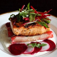 Grilled Salmon and Cannelloni with Cottage Cheese, Beetroot, and Parmesan