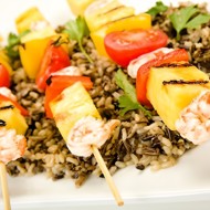 Grilled shrimp and pineapple skewers with teriyaki sauce and sesame.