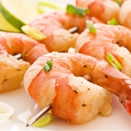 Soak 8 wooden skewers in cold water for 30 minutes. Clean the shrimp, leaving the tails on. Thread 4 shrimp onto each skewer and arrange in a single layer in a non-metallic dish.