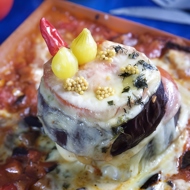 In a baking dish, layer the eggplant evenly, followed by a third of the sauce and grated cheese. Repeat the layers with the squash and zucchini. Top with garlic, basil, and red pepper flakes. Cover with foil and bake for about 35 minutes until the vegetables are tender. Let it rest for 5-10 minutes and serve.